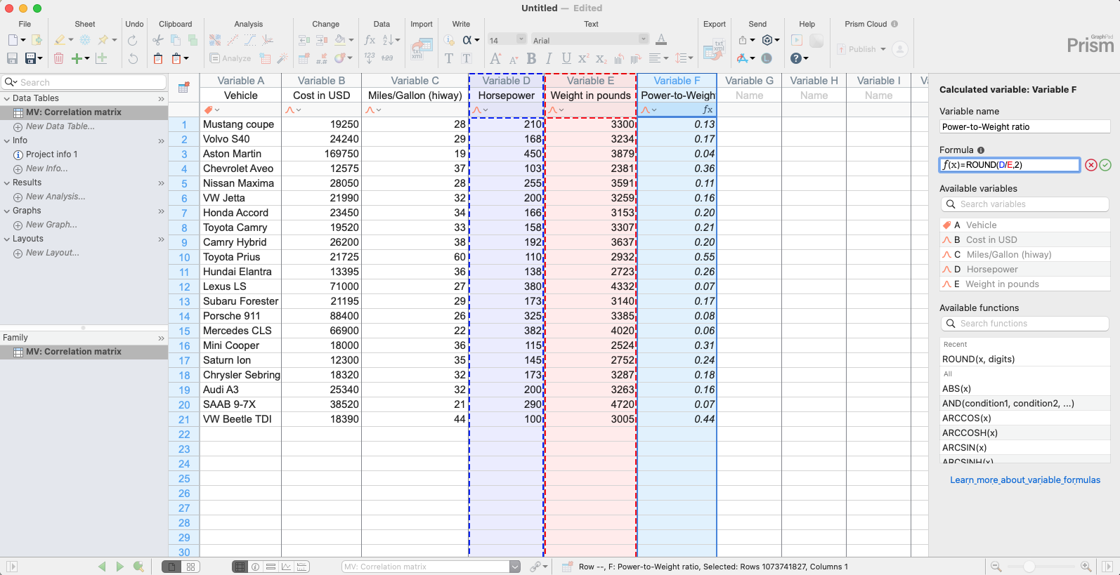 多変量テーブル内で、Excel などのスプレッドシートのような表計算スタイルの数式を用いてデータ変換できます。