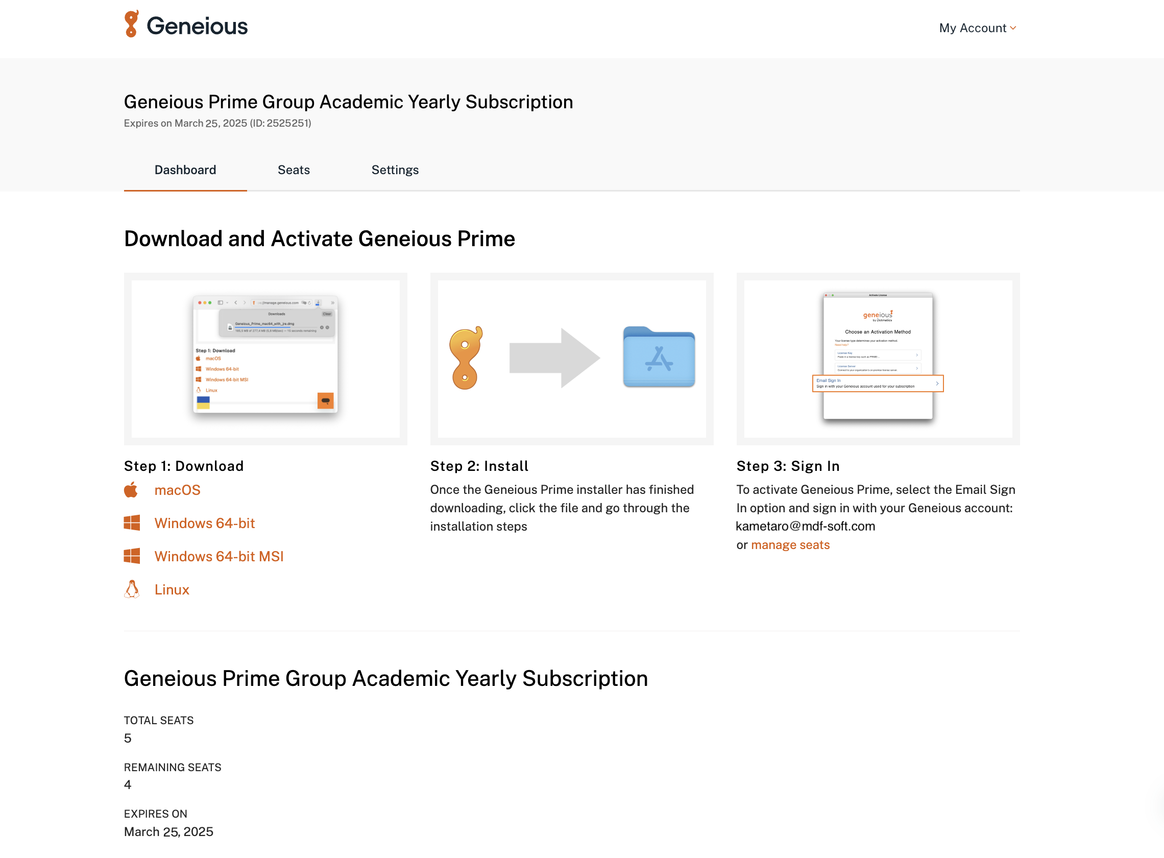 ライセンスの有効期限は My Account ページから確認できるほか、About Geneious Primeダイアログから確認することが可能です。