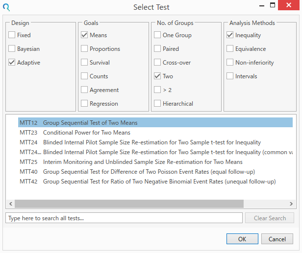 Homeウィンドウで Create a New Table をクリックすると、Select Testダイアログが開きます。Select Testダイアログから、MTT12-2/Group Sequential Test of Two Means(2つの平均のグループ逐次デザイン)を選択します。