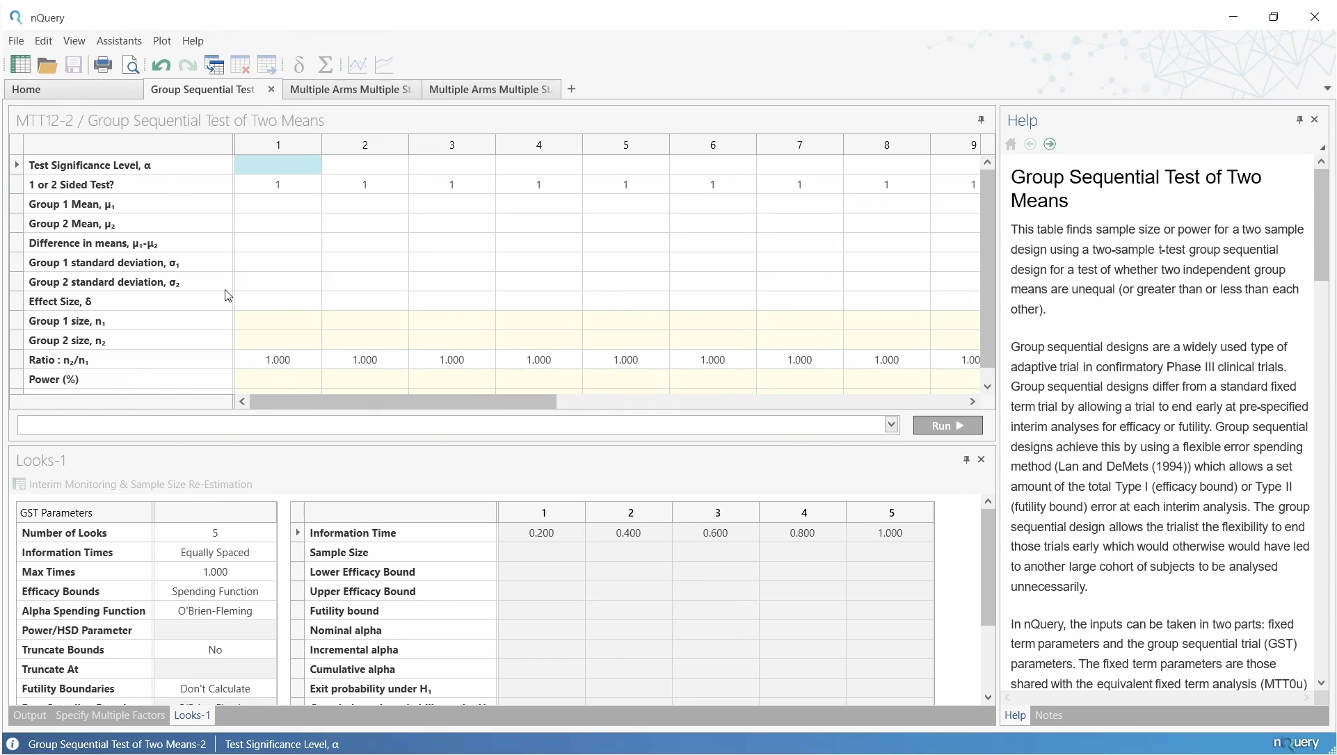 Looksウィンドウは2つのテーブルで構成されています。左側のテーブルには、グループ逐次デザインを定義するパラメータを入力します。