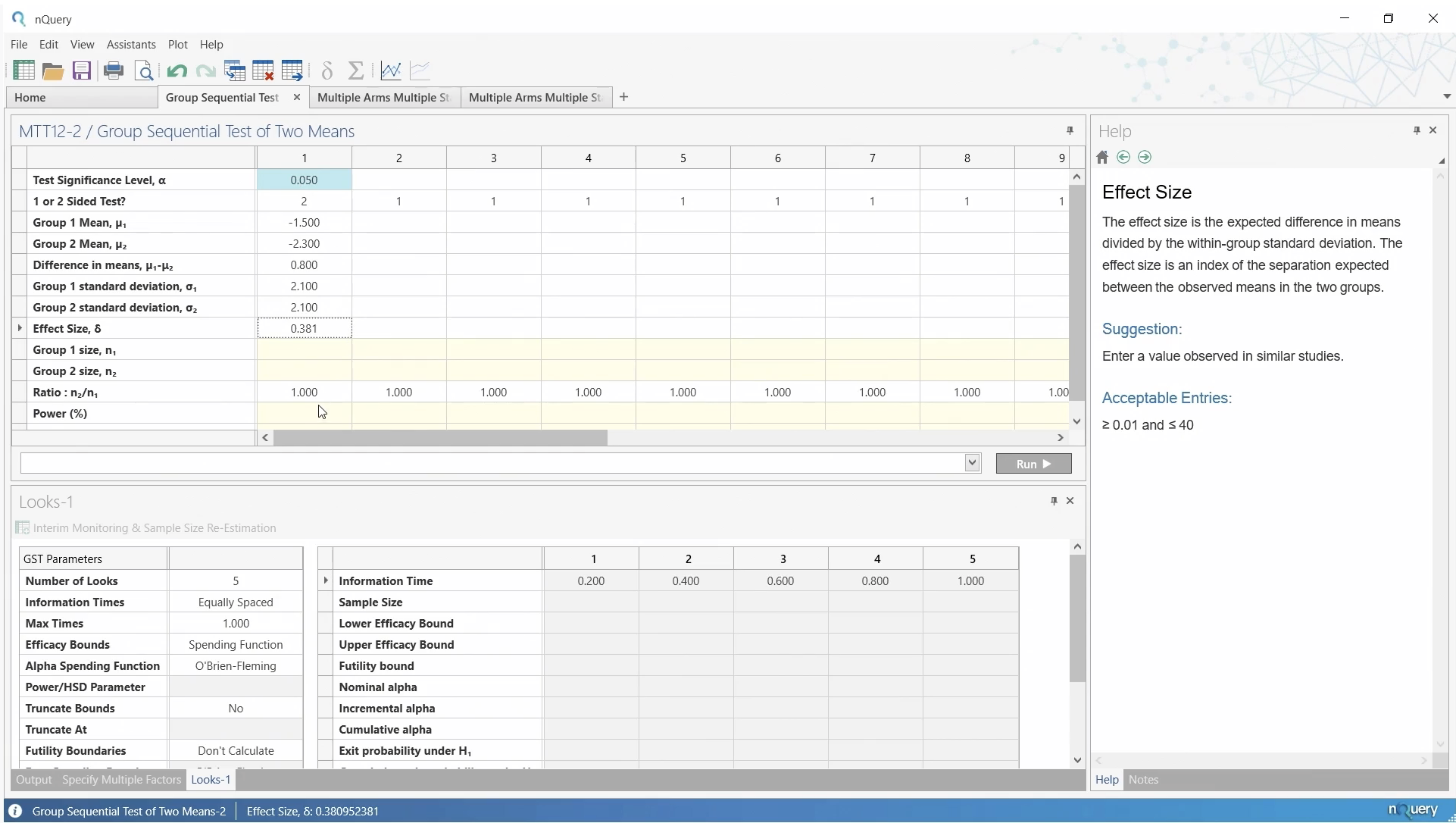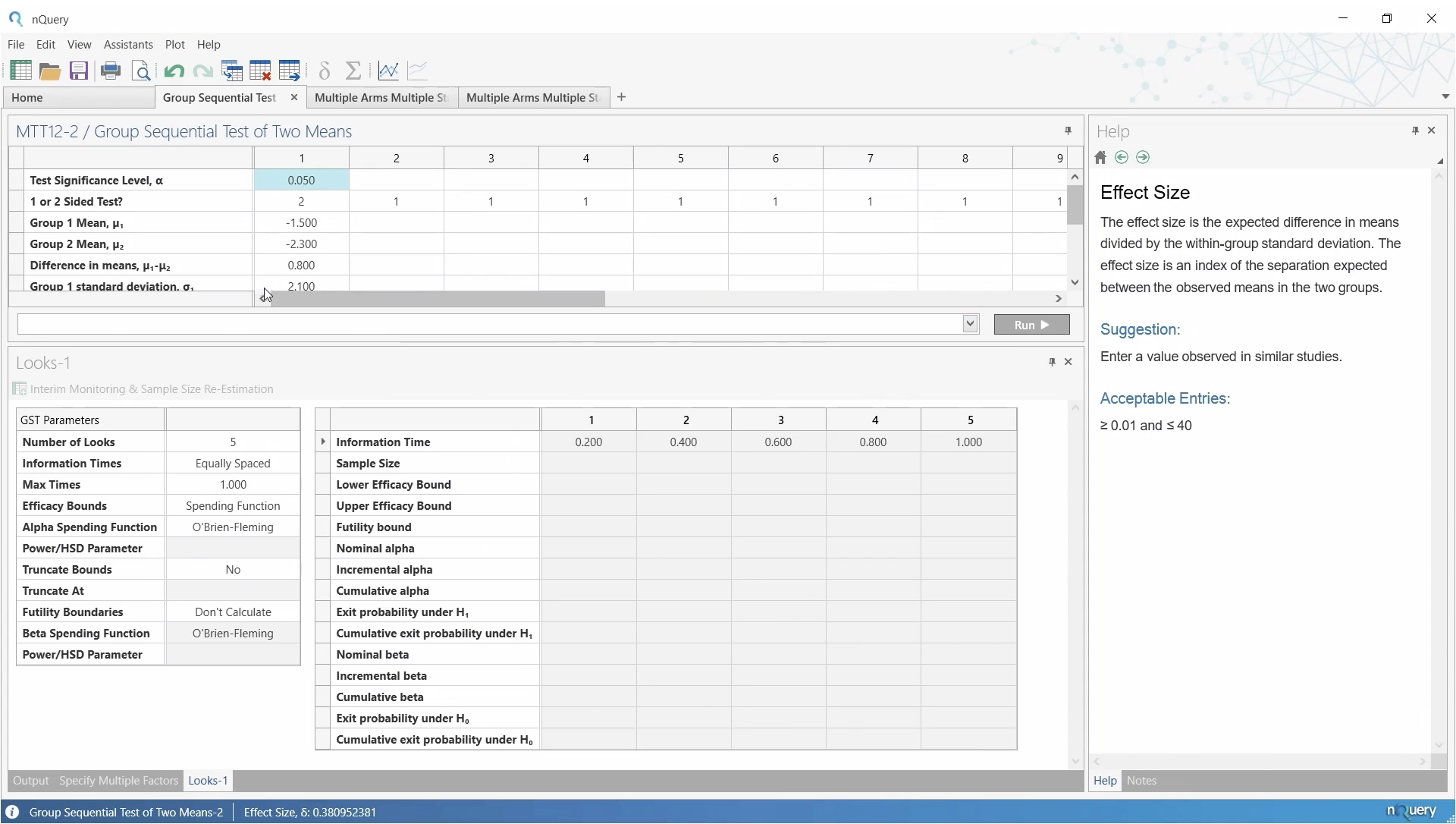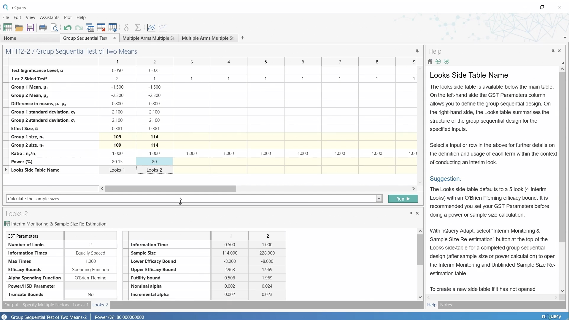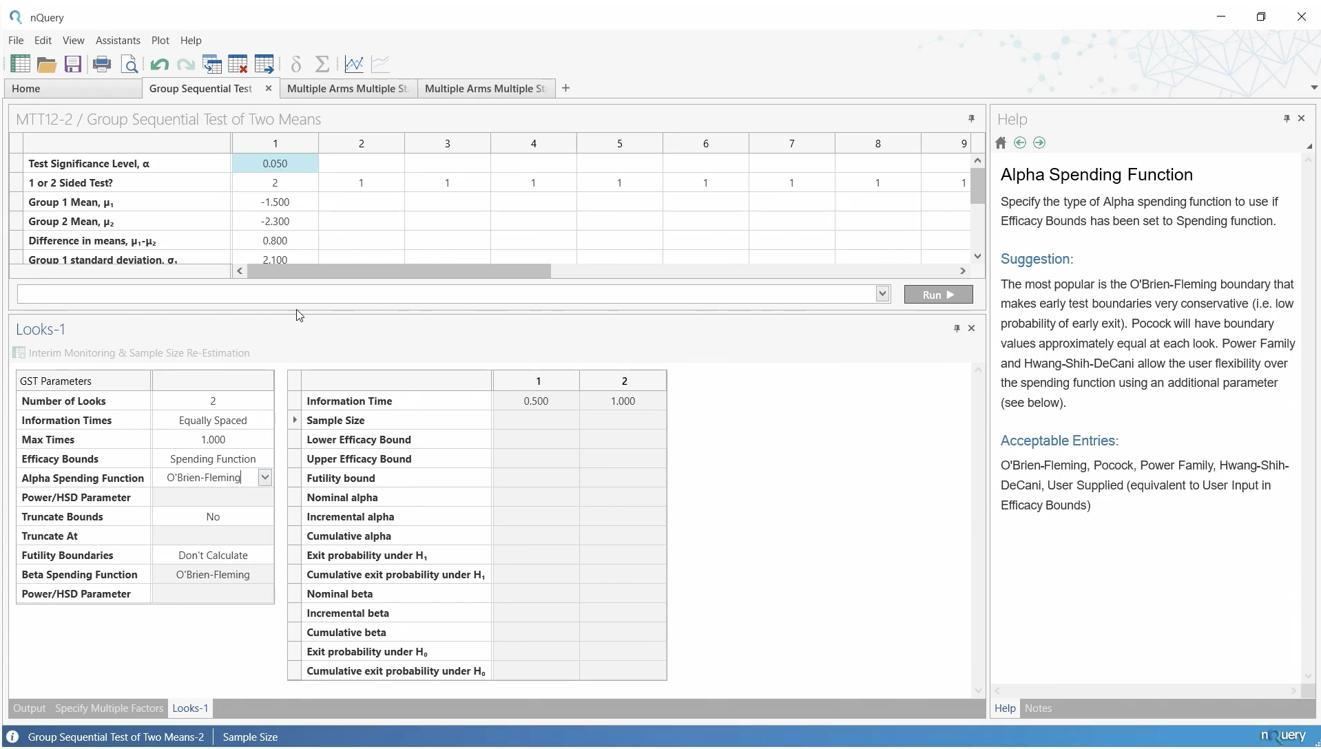 次にLooksウィンドウで、2回の解析と O’Brien-Fleming の消費関数を使用する同じグループ逐次デザインを再現します。
