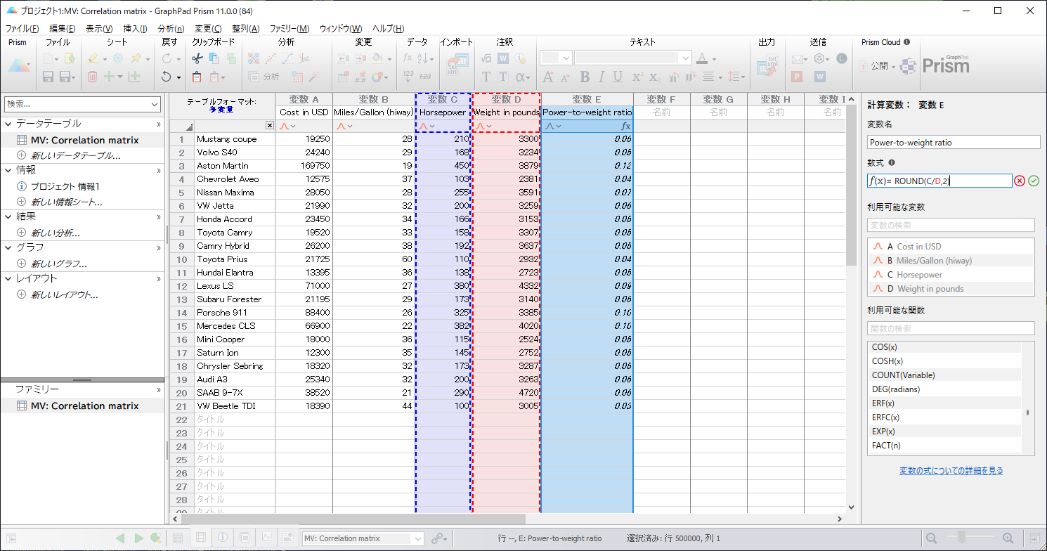 多変量テーブル内で、Excel などのスプレッドシートのような表計算スタイルの数式を用いてデータ変換できます。