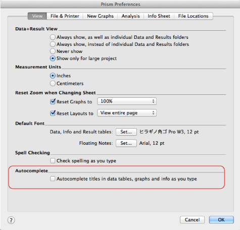 GraphPad Prism 5は、OS10.7( Lion)以前ににリリースされているため、10.7および10.8に追加されたフルスクリーン、自動バックアップ機能等に対応していません。また、Prism5につきましては、以下のような不具合が報告されています。尚、これらの問題をフィックスするアップデートバージョン Prism 5(5.0f)がリリースされております。Prismを起動し、Helpメニューから”Check for Updates”を選択すると、ブラウザが開きGraphPad Software社のページが表示されます。こちらのページから、Prism5.0fへのアップデート版をダウンロード下さい。