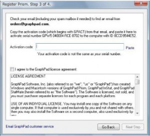 GraphPad Software社のウェブサイトでオンライン登録を完了すると、Activation code(アクティベーションコード)が送付された旨のメッセージが表示されます。”Your activation code has been emailed(アクティベーションコードがEmailで送られました)” という画面が表示されない場合、オンライン登録が完了していない事が考えられます。