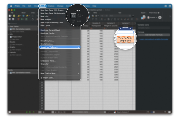 スプレッドシートスタイルの式で、直接新しい変数を [多変量/Multiple Variables] データ テーブル内に作成します (Prism Pro と Enterprise に含まれる)。