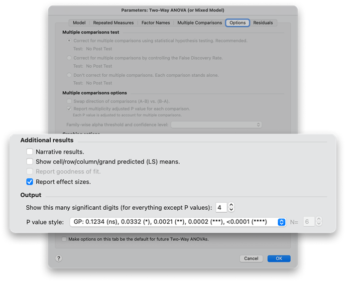 カテゴリー変数間の交互作用を含むモデルに対し、Prism は結果で完全なANOVA表を報告します (以前は、基本的なものだけが提供されました)。