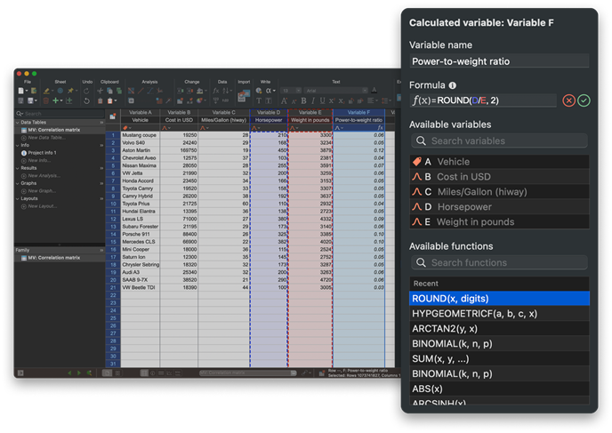 リアルタイム更新: いつでも変数の式を編集します。 元の値が変更されると、計算された値は自動的に更新されます。 作成された変数は、[多変量/Multiple Variables]テーブルで機能するあらゆる分析で、独立、従属、またはグループ化変数として使用できます。